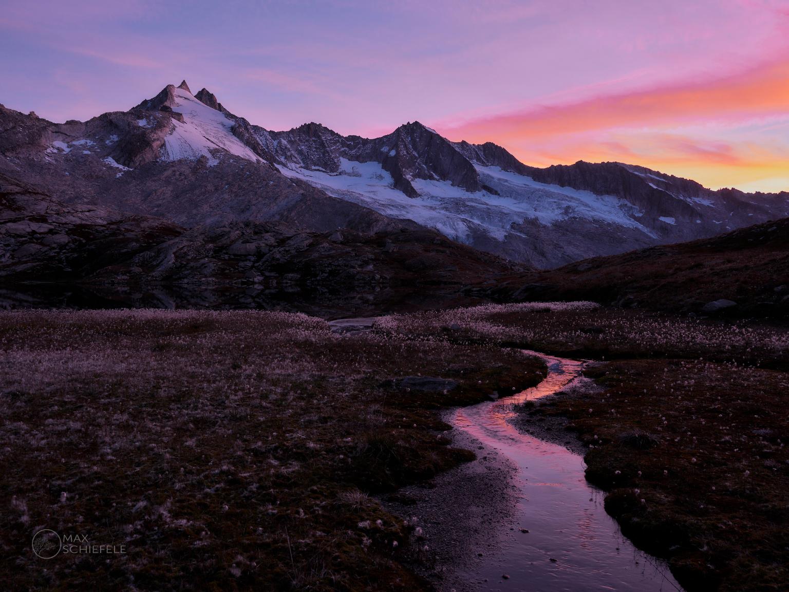 Wir leisten uns den Luxus, einige Shots fürs Fokusstacking zu machen. Das Wollgras im Vordergrund und den Gletscher am Horizont knackscharf zu haben, sind einfach eine zu verlockende Vorstellung. Dann ist's schnell stockfinster, über uns die Sterne und wir steigen mit Stirnlampen zur Hütte ab. Unterwegs gehen aber immer noch "schnell" ein paar Fotos von der Milchstraße. Hier oben ist die Lichtverschmutzung gleich Null und die spontane Astrofotografie Pflicht.